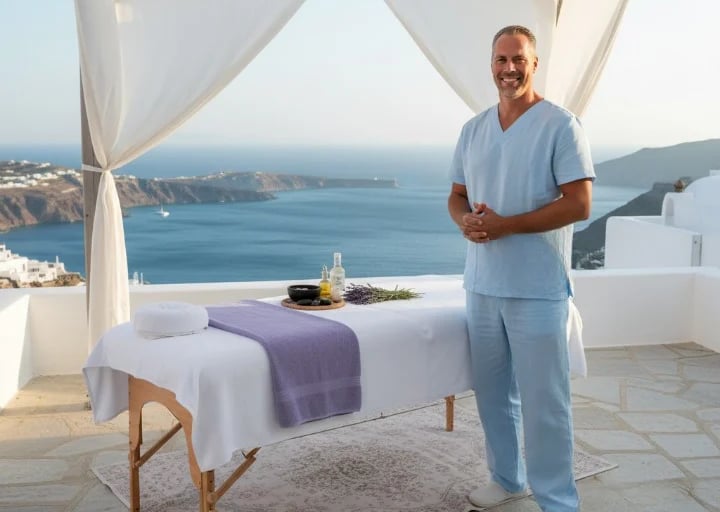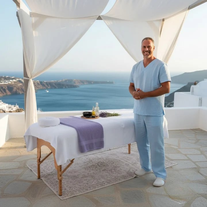 We use high-end portable tables, luxury linens, and organic Cretan oils to ensure the quality matches a 5-star hotel spa.